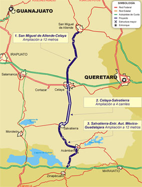 | La consolidación del corredor carretero San Miguel de Allende - Celaya - Acámbaro - Carr. Fed 120 (caseta Zinapécuaro, Mich) incluye una serie de acciones de modernización y ampliación de la red para mejorar los niveles de servicio en una longitud de aprox. 170 km, incluyendo los libramientos de Comonfort y Salvatierra. |