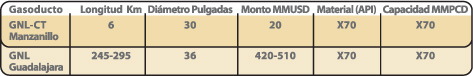 Para este proyecto se contratará la prestación del servicio de transporte de gas natural, se incluirá tanto el gasoducto a la ciudad de Guadalajara, como el ramal hacia las Centrales Manzanillo I y II. Se ha previsto un ducto bidireccional, para prever una posible contingencia en el abastecimiento del GNL, así como para garantizar el volumen en base firme contractual (take or pay), con una reserva de transporte Guadalajara-Manzanillo de al menos 500 MMPCD.